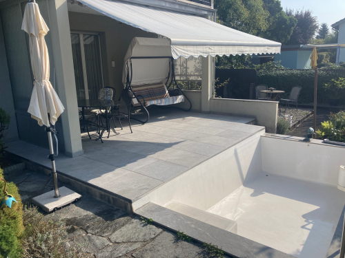 Verlegen von grossformatigen Platten 60x120cm um den Schwedenofen als Brandschutz verlegt