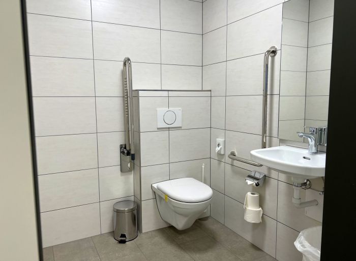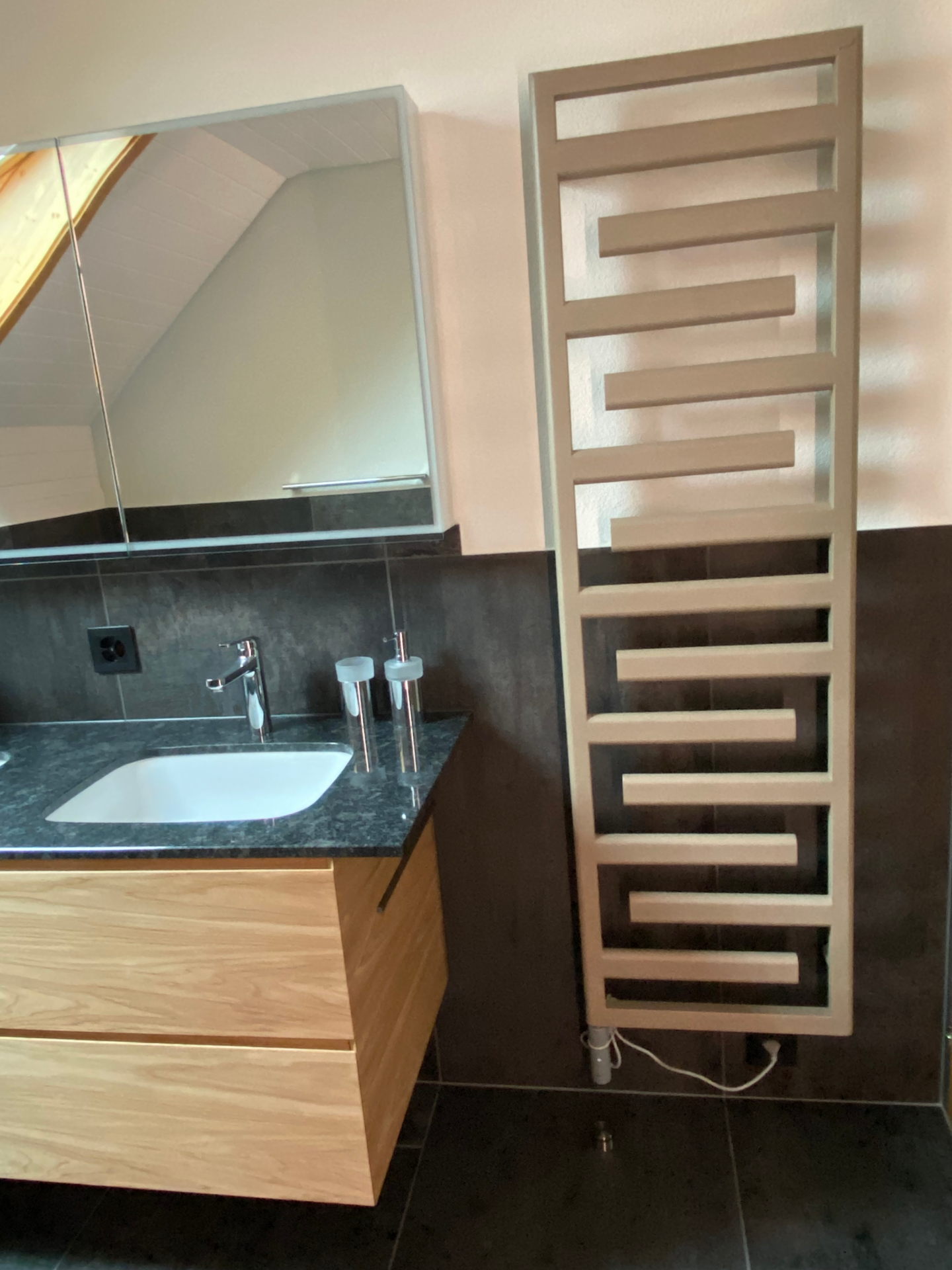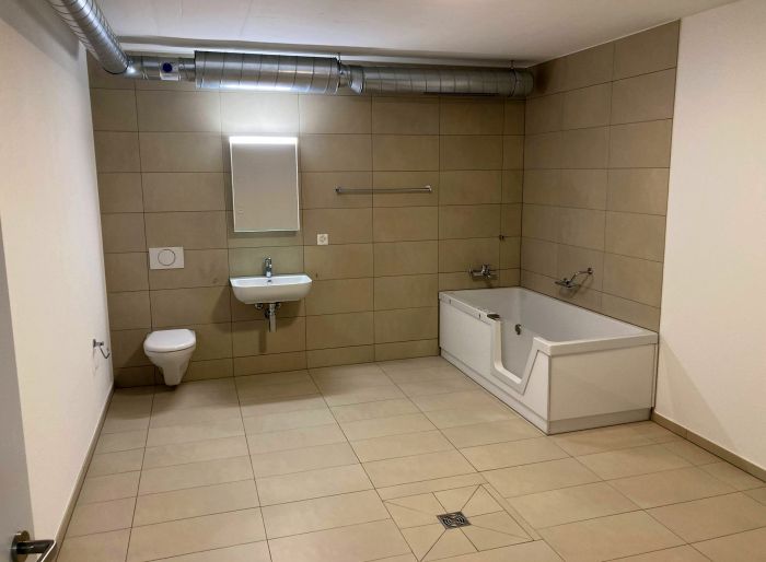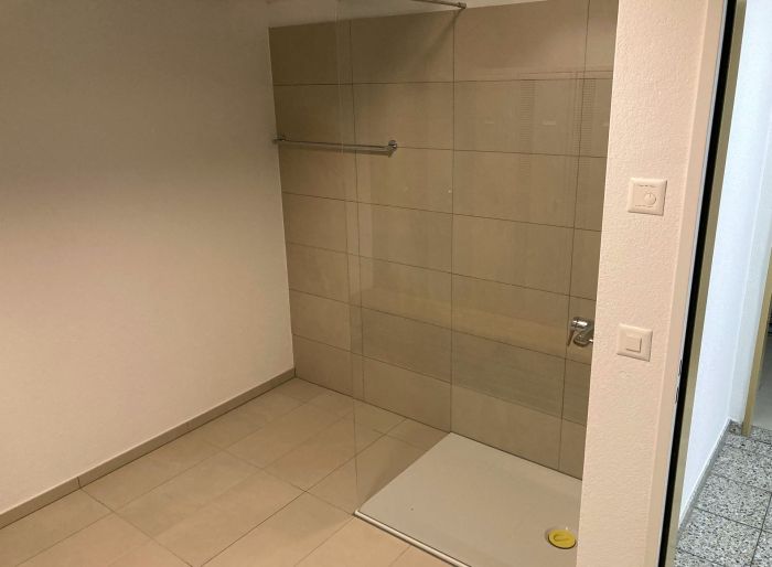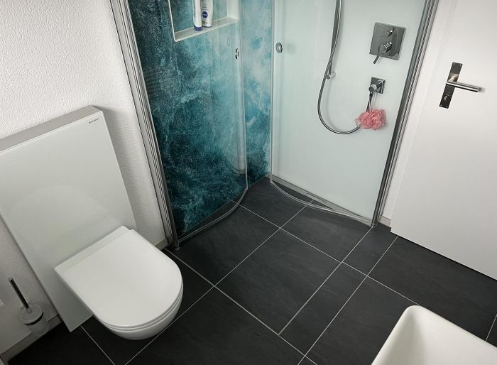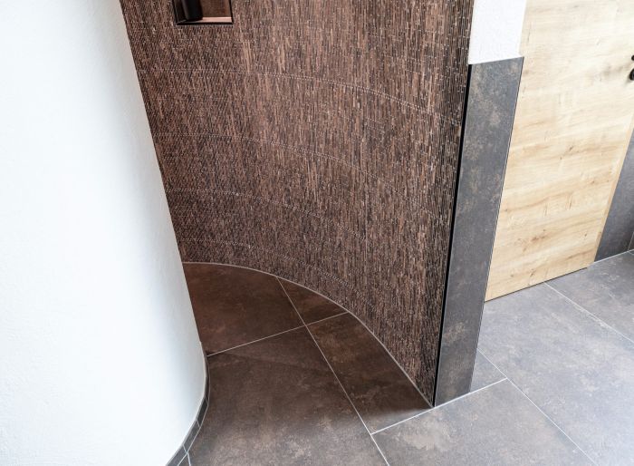 Ausserhalb Duschbereich Wandplatten 60x120cm stehend verlegt.