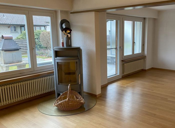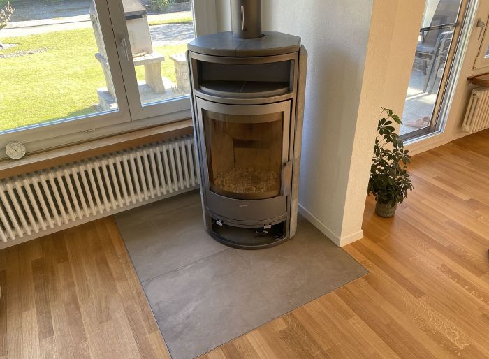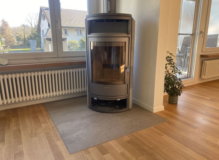 Verlegen von grossformatigen Platten 60x120cm um den Schwedenofen als Brandschutz verlegt