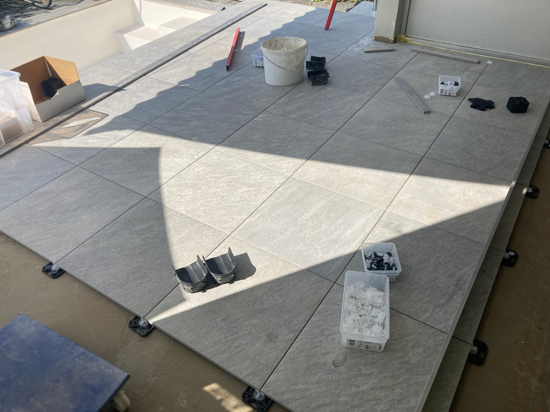 Die Keramik Platten werden auf sogenannten Stelzlager verlegt und ausgerichtet.